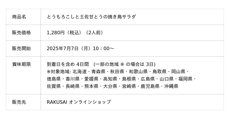 楽彩株式会社(本社:東京都足立区/代表取締役社長:大崎善保)は、日本全国から選りすぐりの旬のとうもろこしが大集合する《とうもろこしフェア2025》を公式オンラインショップにて開催しております! 同時に、昨年も大好評だった夏限定ミールキット「とうもろこしと土佐甘とうの焼き鳥サラダ」の販売が本日スタート。この夏は、楽彩が贈るとうもろこしの魅力を存分にお楽しみください!
