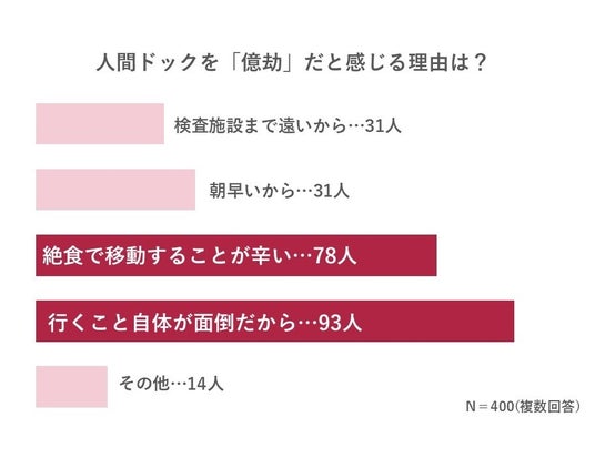 ■女性の7割が、人間ドックに「億劫な気持ち」を感じていると回答。行くこと自体の面倒さ、絶食移動の辛さが主な要因か