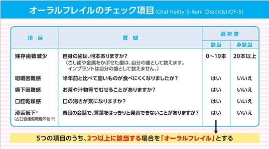 【OF-5(Oral frailty 5-item Checklist)】オーラルフレイルに該当するかどうかを手軽にセルフチェックできるように開発された5つの質問からなるリスト(下図参照)。5項目中2項目以上該当で、オーラルフレイルに該当となります。