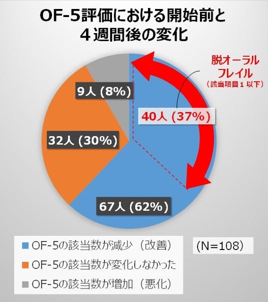 オーラルフレイルに該当する108名のうち、67人(62%)に何らかの改善が見られ、その内の40人(37%)はOF-5の該当項目が1項目以下であり、オーラルフレイルから脱していました。(冒頭グラフ参照)