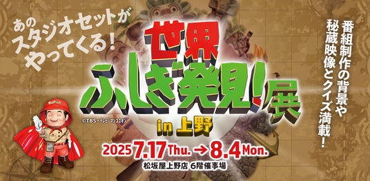 あのスタジオセットがやってくる!7/17(木)~8/4(月)、大人気テレビ番組『世界ふしぎ発見!』(TBSテレビ)が展覧会になった「世界ふしぎ発見!展 in 上野」を松坂屋上野店で開催いたします。1986年から約1700回続く人気番組の貴重映像や出演者と制作者の完全撮り下ろしインタビュー映像を満載し、世界中から収集したふしぎなモノも興味深いエピソードやクイズと共に展示します。そして、番組内ではおなじみの『ボッシュート!』体験ができるスタジオセットを特別展示いたします!