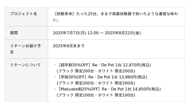 私たちはこれからも「食べる時間」をもっと豊かに、「つくる時間」をもっと軽やかにする製品づくりに挑戦し続けます。ぜひ Makuake の応援購入を通じて、次の炊飯革命をご体感ください。