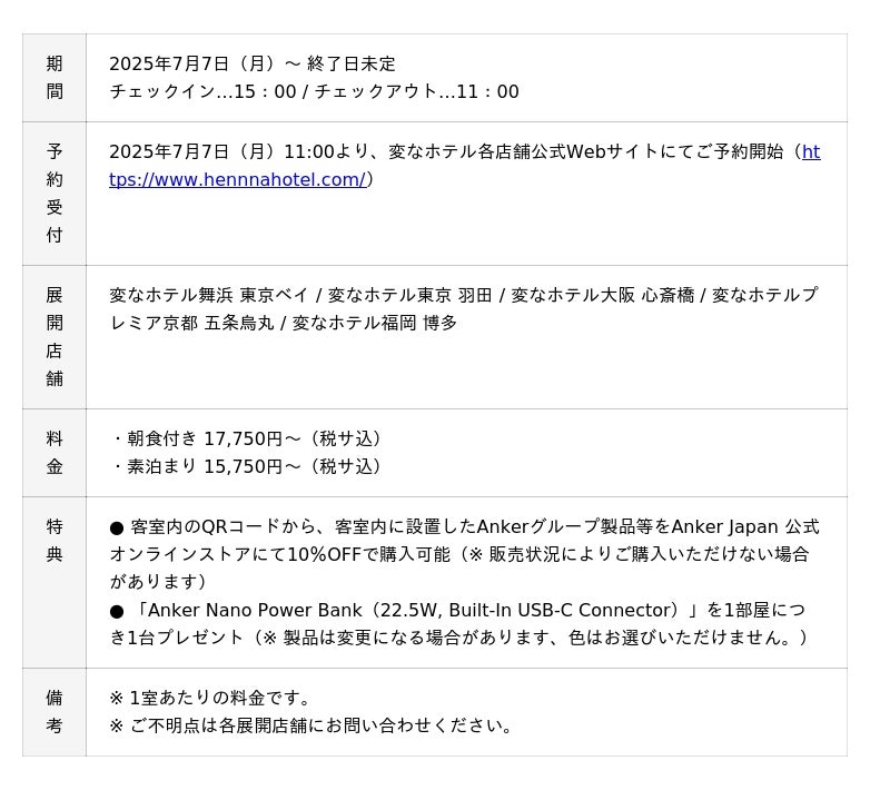 HISホテルホールディングスが運営する全国5箇所の「変なホテル」において、Ankerグループ製品を設置した「Anker Room」を2025年7月7日(月)より開始。「RELAX & CHARGE」をコンセプトに、Anker仕様のオリジナルデザインが施された客室にて、充電関連製品やオーディオ製品等をご使用いただけます。