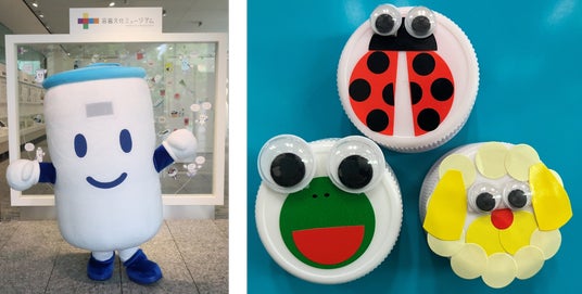 (左)東洋製罐グループのキャラクター缶くんがお出迎え! (右)PETボトルのキャップを使ったかわいいマグネットも作れます!