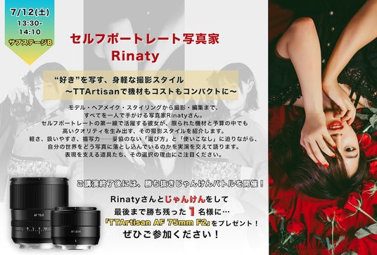 Rinatyさん講演~"好き"を写す、身軽な撮影スタイル ~セルフポートレート写真家Rinatyさんが、『~機材もコストもコンパクトに~』というテーマで、焦点工房製品を使った高クオリティな撮影スタイルを紹介します。