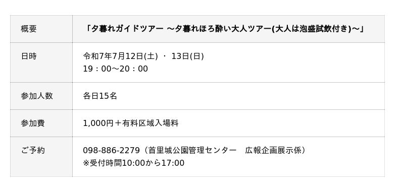 さらに、特別企画として「夕暮れガイドツアー ~首里城 夕暮れほろ酔い大人ツアー~」を実施。ガイドとともに復興が進む首里城内を巡るもので、泡盛の試飲付き(20歳以上)となっており、幻想的な夕景とともに歴史と味わいを堪能できます。
