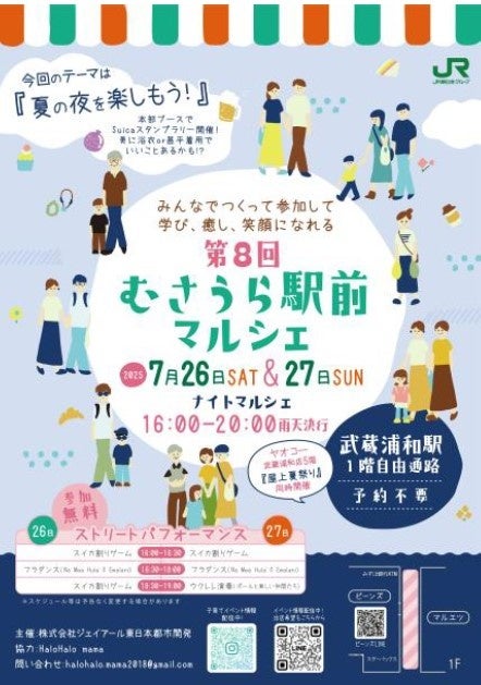 2025年7月26日(土)・27日(日)、武蔵浦和を舞台に、地域で活動するHaloHalo mamaと連携し「第8回むさうら駅前マルシェ」を開催いたします。今回のテーマは「夏の夜を楽しもう!」。涼やかな夜風の中、ワークショップや雑貨販売、飲食ブースに加え、ストリートパフォーマンスなど多彩な企画が盛りだくさん。夏の夜を彩る特別なひとときを、家族や友人と一緒に過ごしませんか?新しい季節の始まりを、笑顔とともに迎えましょう。