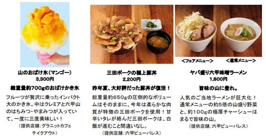 六甲ガーデンテラスには、明石海峡から大阪平野、関西国際空港まで広がる大パノラマの眺望をはじめとして、「デカい(=大きい)」ものが多く存在していることから、今年の夏はグルメも巨大化。エリア内の3つの飲食店舗とテイクアウトコーナーで、六甲山のようにデカくて美味しいグルメをお楽しみいただけます。昨年好評だった総重量約650gの豚丼や夏にピッタリな巨大かき氷、ソフトクリームを通常メニューの約2倍に増量した六甲山麓牛乳ミルクソフトなど、バラエティ豊かなデカ盛りグルメをご用意しています。