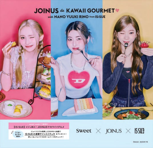 ジョイナスは、2024年に引き続き、今年も女性ファッション誌「sweet」とのコラボキャンペーン開催を決定しました。今回はIS:SUEの3人をお迎えし、ジョイナスのカワイイグルメをたっぷりとお楽しみいただきます。