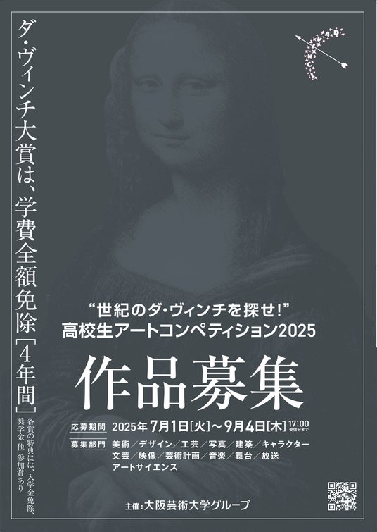大阪芸術大学(学校法人塚本学院/所在地:大阪府南河内郡/学長:塚本 邦彦)は、若き高校生クリエイターの才能発掘と応援を目的としたアートコンペティション「"世紀のダ・ヴィンチを探せ!"高校生アートコンペティション 2025」の作品募集を7月1日より開始しております。イタリア・ルネサンスの巨匠、レオナルド・ダ・ヴィンチは絵画や彫刻の作品はもちろん、建築や自然科学、音楽を通じ、「万能の人」「普遍の人」と呼ばれています。大阪芸術大学では「世紀のダ・ヴィンチを探せ」というスローガンの下、高校生を対象としたアートコンペティションを開催し、言語表現を含む様々な芸術ジャンルから作品を公募します。受賞者には、大阪芸術大学グループ各校の学費が全額免除もしくは奨学金が支給される「ダ・ヴィンチ大賞」をはじめ、複数の賞が用意されています。才能溢れる若き高校生クリエイターからのご応募をお待ちしております。