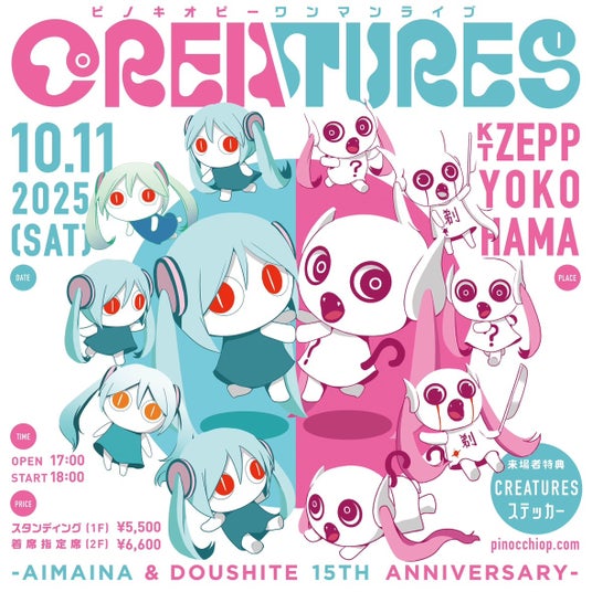 ピノキオピーは、ワンマンライブ『「CREATURES」- Aimaina & Doushite 15th Anniversary -』を2025年10月11日(土)にKT Zepp Yokohamaにて開催いたします。本公演はアイマイナ&どうしてちゃんの誕生15周年を記念するライブとなります。また、チケット最速先行受付(抽選)を本日7月7日(月)より開始したこともあわせてご報告いたします。