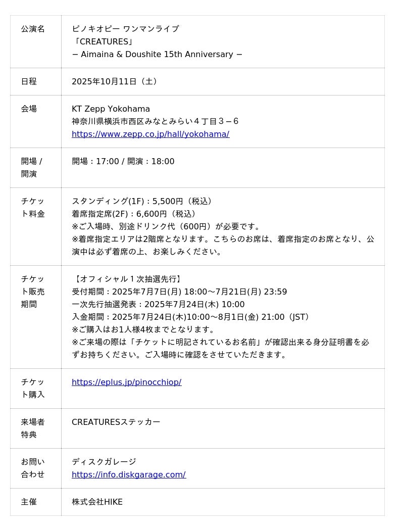 ピノキオピー ワンマンライブ 「CREATURES」お問い合わせ窓口