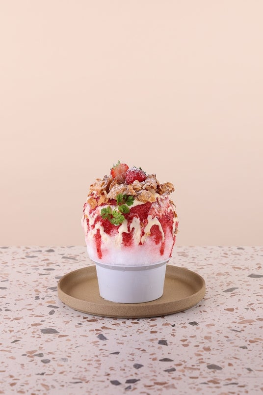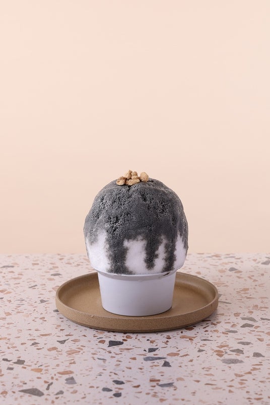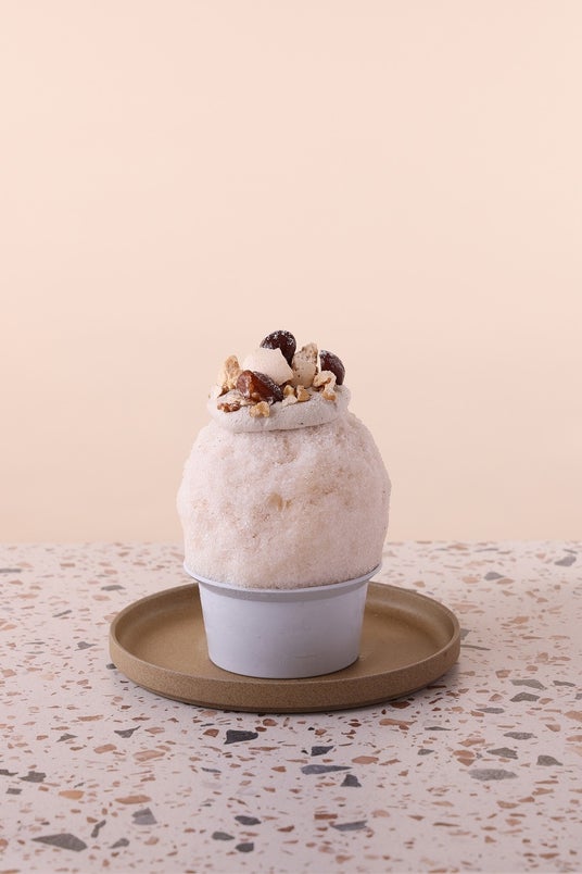 香ばしさとコクが広がる黒胡麻シロップに、キャラメリゼしてきな粉をまぶしたクルミが寄り添う、奥行きある味わいの一品。さらに中には特製の練乳白餡がアクセントとして仕込まれています。それぞれの素材を存分に味わえるのは、シンプルな構成ならでは。秋冬の限定商品として販売しましたが、かき氷通のお客様から再販を望む声を多数頂き、2025年夏に復活販売。求肥が入ってさらに美味しくなった自信作をお届けします。