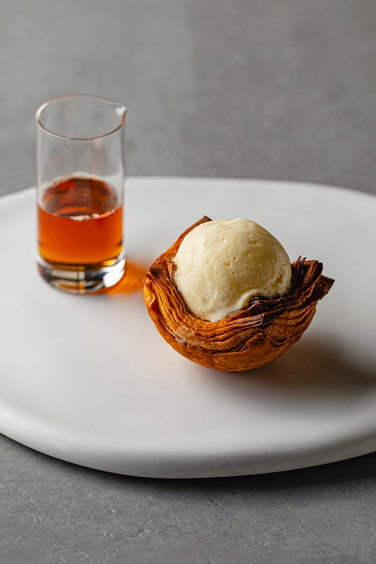 サクサクのクロワッサンに、冷たいバニラアイスをのせて。さらに仕上げは、とろ~りメープルシロップ。香ばしさと冷たさが同時に味わえる、"食べ歩きスイーツ"。ひと口食べれば、サクッ、とろっ、ひんやり。歩きながらでも楽しめる、ちょっと特別な一品です。