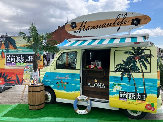 マンナンライフキャラバンカーが横浜赤レンガ倉庫で開催の【FUN! ALOHA! 2025 in YOKOHAMA 】に登場!新商品「蒟蒻畑塩レモン味」を無料配布!