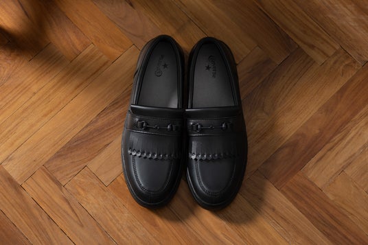 オールスター クップをベースに、ローファー仕様へとアレンジした上品な一足が直営店限定で登場。タッセルとビットをあしらったクラシカルなディテールを、アッパーからインソールロゴ、ビット金具に至るまでブラックで統一。ドレッシーなスタイリングにもマッチするシックなデザインに仕上げた。