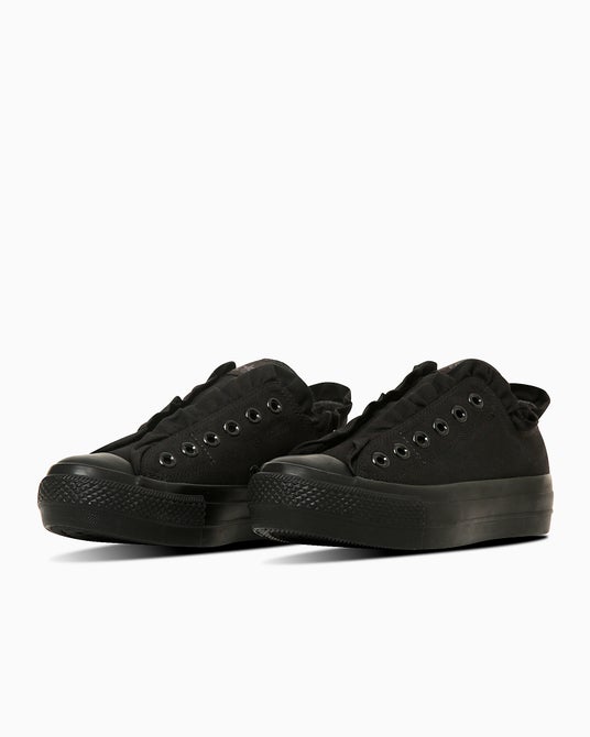 厚底ソールをベースに、フリルディテールを加えたガーリーな印象の直営店限定モデル。PLTS(プラットフォームソール)タイプに、オンスの低いキャンバス素材でやわらかなフリルを羽根部分に挟み込んだ華やかなデザイン。シューレースを通して履くこともできる2WAY仕様で、気分に合わせたスタイリングが楽しめる。