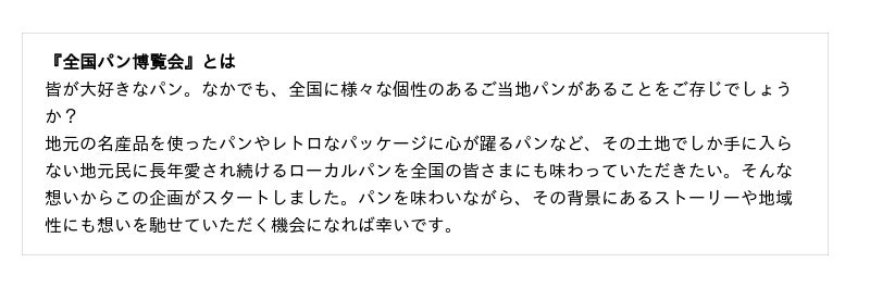 『全国パン博覧会』は、北海道から九州・沖縄まで全国の人気のご当地パンが集結するイベントです。地元の名産品を使ったパンやレトロなパッケージに心が躍るパンなど、その土地でしか手に入らない地元民に長年愛され続けるローカルパンが一堂に会します。