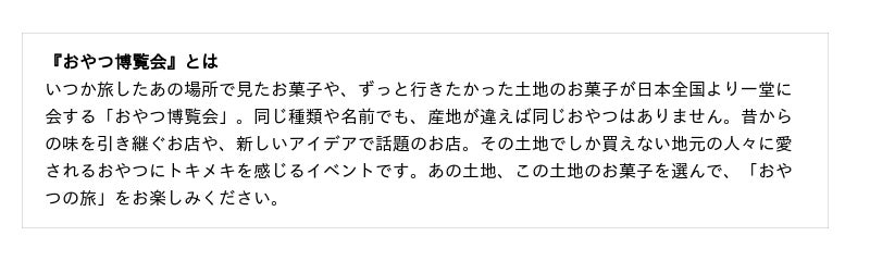 また、全国のご当地おやつを集めたイベント『おやつ博覧会』を千葉県内では初めて「幕張 蔦屋書店」(千葉県千葉市)で7月21日(月・祝)より開催します。