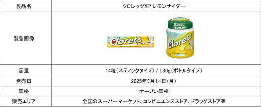 モンデリーズ・ジャパン株式会社(本社:東京都品川区 / 代表取締役社長:碇祐輔)は、息スッキリの「クロレッツ」ブランドより、「クロレッツXP レモンサイダー」を7月14日(月)より、全国で新発売いたします。爽やかなレモンの香りとサイダーの程よい苦味でさっぱりとした甘みが特長の商品となっており、清涼感のある後味でスッキリ感をお楽しみいただけます。
