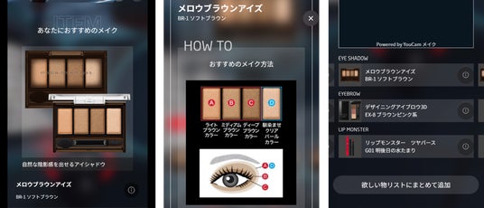 分析結果に基づき、KATEの提唱する「陰影メイク」に欠かせないアイシャドウやアイブロウなどの商品がリコメンドされます。さらに、Web上で実際に商品をお試しいただけるバーチャル体験や、各商品の効果的な使い方を分かりやすく解説したHowToコンテンツも充実。また、公式通販サイト「My Kao Mall」との連携により、気に入った商品はそのままスムーズにご購入いただけます。