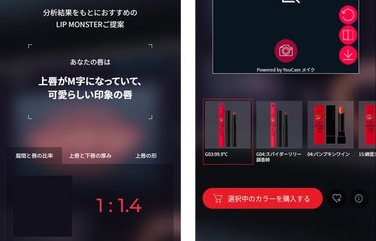スマートフォンのカメラで顔をスキャンすることで、唇の形や比率を分析。KATE独自の分析により、全6パターンの唇タイプに分類します。その結果をもとに、多彩な色や質感を展開するリップモンスターシリーズの中から、あなたの唇タイプに合う商品を提案します。