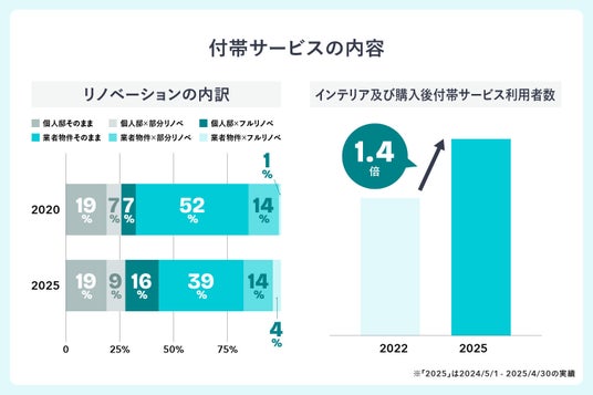 また、保険商品、ファイナンシャルプランナー相談など提携サービスの提供を通じて住宅購入とその後も続く暮らしの安心・快適に貢献する購入後付帯サービスとインテリアサービスの利用者数の合計は、2022年(※12)と2025年(※11)の比較で1.4倍増加しました。