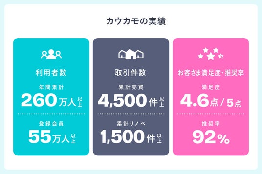 また、「カウカモ」で住宅を購入されたお客さまからは、購入体験の満足度4.6点/5点(※2)、友人や知人への「カウカモ」の推奨率92%(※3)と、多くのご支持をいただいています。