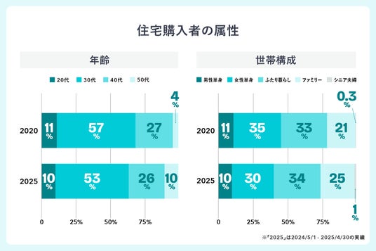 「カウカモ」で住宅を購入されたお客さまの属性について、2020年(※4)と2025年(※5)の実績を比較すると、年齢別では、ライフステージが変化しやすい「30代」と「40代」の合計が両年とも8割前後を占めている一方で、「50代」のお客さまが4%から10%に増加しました。