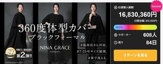 レディースフォーマルウェアを展開するフォーマル専門店 nina's(ニナーズ・長崎県長崎市)は、身体のラインを拾わない独自のパターン技術で誕生した「360度体型カバー ブラックフォーマル」の第2弾を、応援購入サービス「Makuake (マクアケ)」にて先行販売中です。