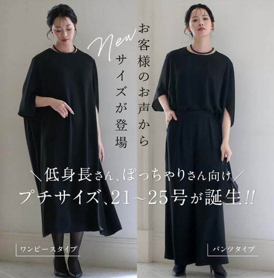 昨年、Makuake (マクアケ)ブラックフォーマル史上No.1(※2025年6月1日時点 自社調べ Makuakeにおける「ブラックフォーマル」として)となる応援購入総額を記録した「360度体型カバー ブラックフォーマル」。その第2弾となる本プロジェクトでは、低身長の方向けの「プチサイズ」、ふくよかな方向けの「21~25号」を追加し、選べる「ワンピーススタイル」「パンツスタイル」の2スタイルでお届けします。