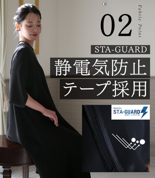 ワンピースの裾に特殊伝導糸100%の静電気防止スピンテープ「STA-GUARD(TM)」を縫い付けています。着脱時のパチパチや脚へのまとわりつきも防ぎます。洗濯耐久性も抜群で、洗濯を繰り返しても長く効果が持続します。