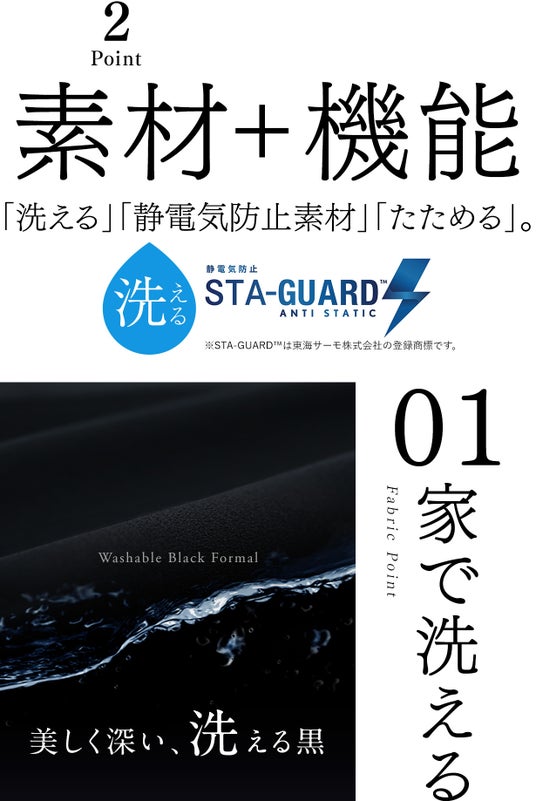 ブラックフォーマルは「家で洗える」時代へ。明日・明後日に急に必要になった時も、着用した後も、さっと自宅で洗えていつでも清潔な着心地を叶えます。洗濯ネットをご使用いただければ「ご家庭にある洗濯機」で洗うことができて、洗濯後の縮みや色あせの心配もありません。