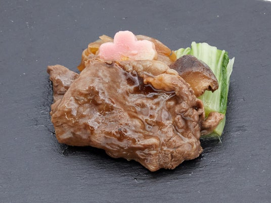 亀岡牛に泉州黄玉葱「吉見早生」と別府産椎茸の旨みをのせ、かめびし醤油で味付け。堺の大阪しろなが彩りを添える上品なひと品です。
