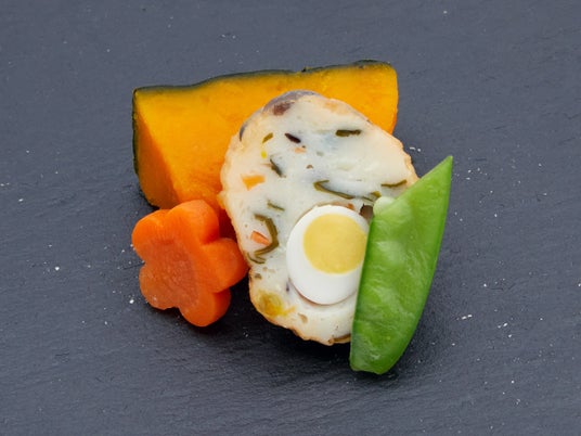 伊勢ひじきなど9種類の食材を練り込んだ団子と、甘くホクホクの山口産かぼちゃを一冨士伝統の出汁で炊き合わせました。