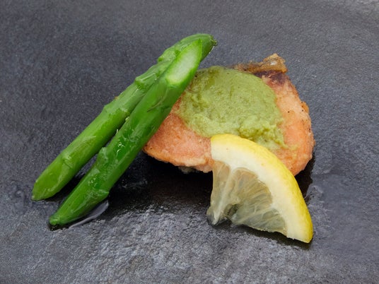 塩引き鮭と丸亀産のグリーンアスパラを香ばしく焼き、木の芽味噌のソースで風味豊かに仕上げました。