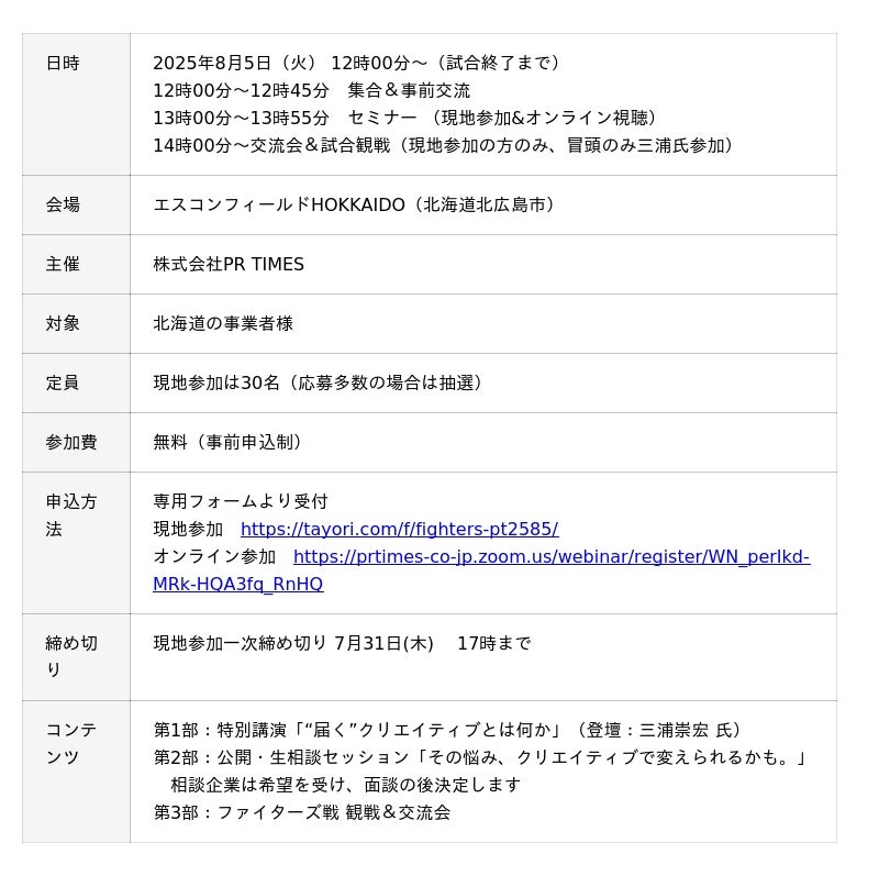 プレスリリース配信サービス「PR TIMES」等を運営する株式会社 PR TIMES(東京都港区、代表取締役:山口拓己、東証プライム:3922)は、2025年8月5日(火)に北海道日本ハムファイターズの本拠地エスコンフィールドHOKKAIDOで、広報PRを業界トップランナーから生で学ぶ特別セミナーと観戦交流会を開催いたします。