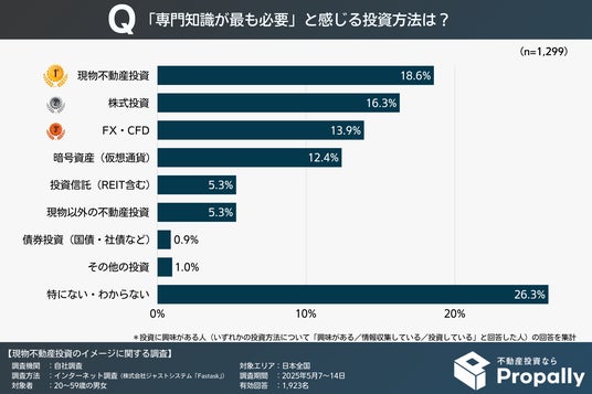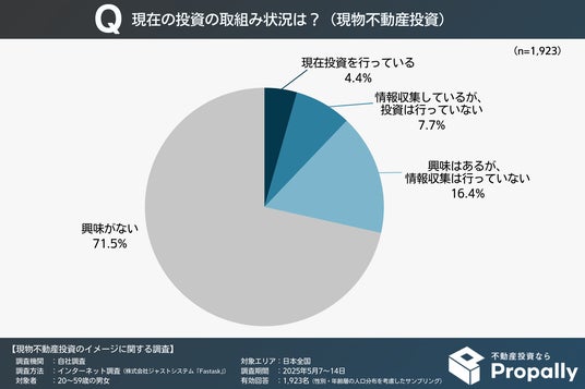 不動産投資プラットフォームの開発・運営を行うPropally株式会社( https://propally.co.jp/ )(本社:東京都港区、代表:齊藤郁織)は、不動産投資に対するイメージや、他の投資方法との違いを明らかにするため、全国の20~59歳男女1,923名を対象にを対象にアンケートを行いました。本調査では、現物不動産投資を行っている人は少数にとどまっており、初期投資額の高さや運用・管理の手間が特に大きなハードルとなっていることがわかりました。