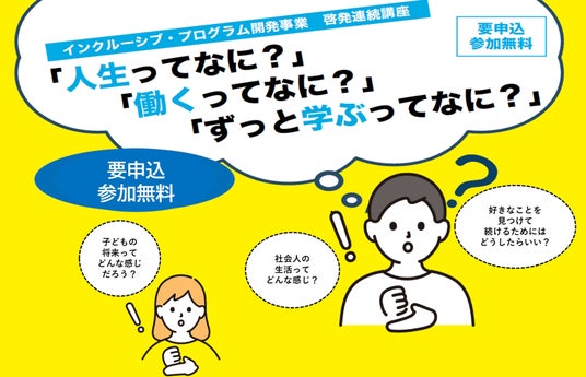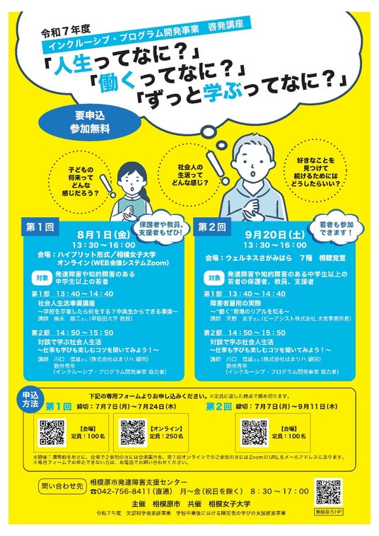 このたび、「インクルーシブ・プログラム開発事業(さがみはら・学ぶ楽しみ発見プログラム)」の一環として、啓発講座「人生ってなに?」「働くってなに?」「ずっと学ぶってなに?」を8月・9月に開催します。