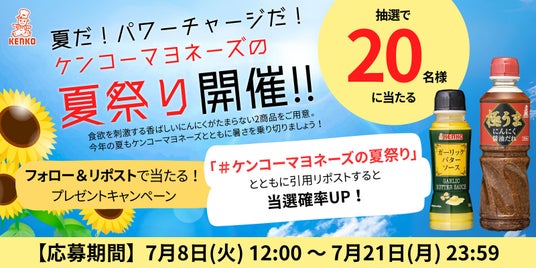 ケンコーマヨネーズ株式会社(東京本社:東京都杉並区、代表取締役社長:島本 国一、以下「当社」)は、日頃のご愛顧に感謝し、当社公式Xをフォロー&リポストすると、当社人気の2商品がセットで当たるキャンペーンを本日7月8日(火)から7月21日(月)まで実施します。