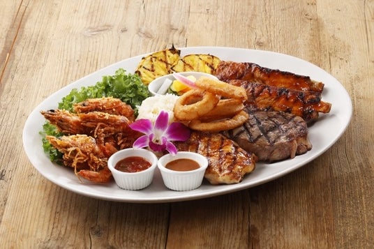 アロハ!ビッグアイランドプラッター「ポリネシアンソース」で焼き上げたBBQポークリブ(2p)、リブロースステーキ(225g)、テリヤキチキン(150g)、ガーリックシュリンプ(4尾)。ハワイの美味しさを一⽫に集めた贅沢なプレート。