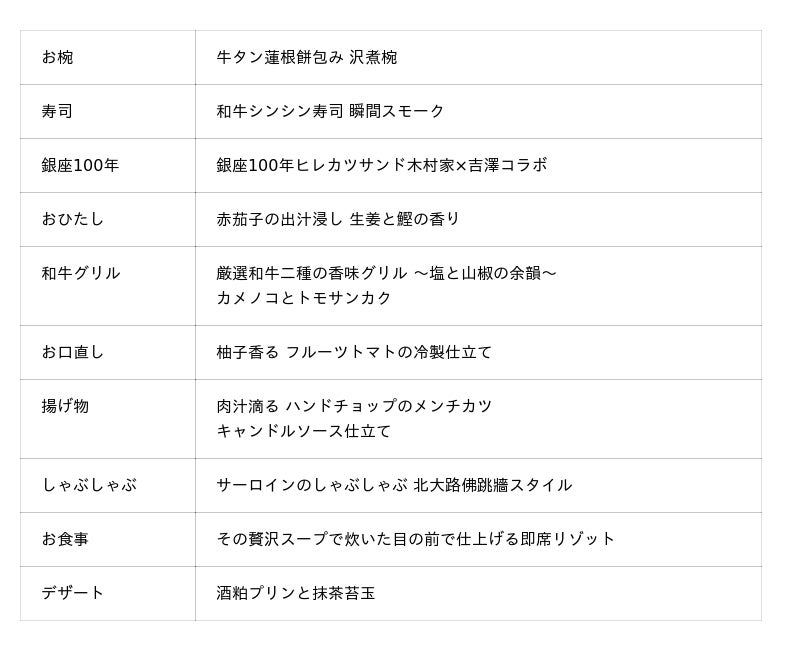 ■銀座のシークレットカウンターで体験する 「板前和牛料理フルコース」メニュー例
