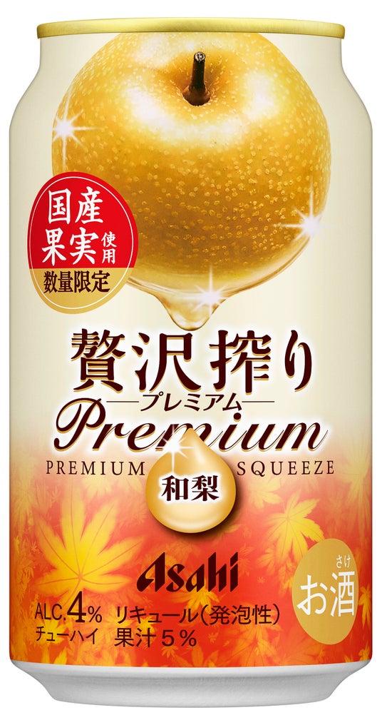 『アサヒ贅沢搾りプレミアム数量限定国産和梨』は、和梨果汁を5%使用したチューハイです。和梨ならではの芳醇な香りと甘みが特長です。パッケージは、缶体上部に大きな和梨のイラストと"国産果実使用"のアイコンを配置し、缶体下部に紅葉を描くことで秋らしいデザインに仕上げました。