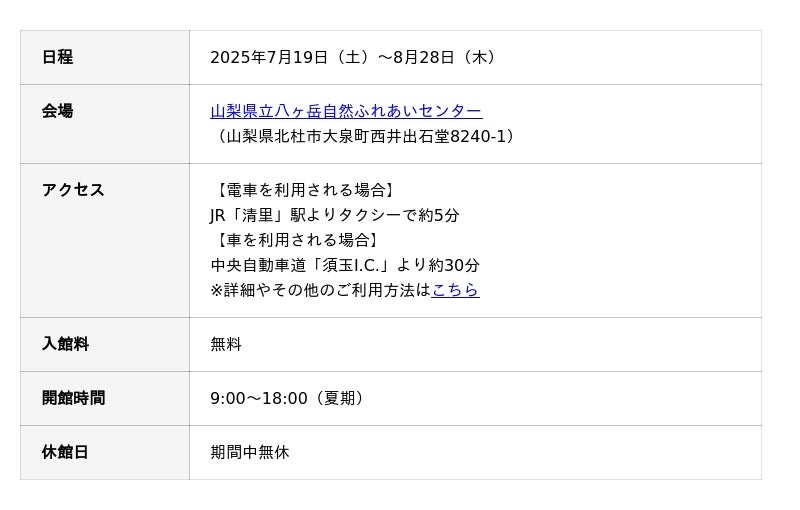今回、第13回コンテストの優秀作品25点を、2025年7月19日(土)~8月28日(木)まで、「山梨県立八ヶ岳自然ふれあいセンター」にて展示します。