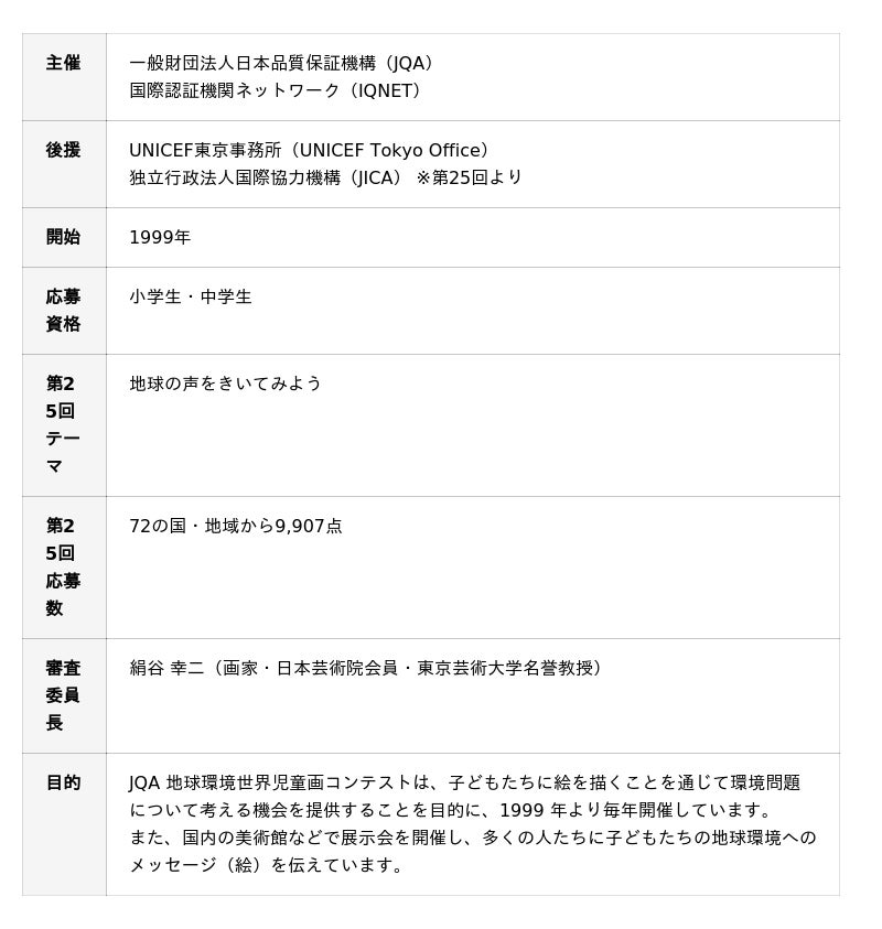 一般財団法人日本品質保証機構(東京都千代田区、理事長:石井 裕晶、略称:JQA)と国際認証機関ネットワーク(スイス・ジュネーブ、略称:IQNET)が主催し、UNICEF東京事務所(東京都渋谷区)の後援による「JQA地球環境世界児童画コンテスト」は、1999年より開催しております。