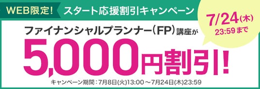 株式会社ユーキャンでは7/8(火)よりWEB限定キャンペーンを開始しました。7/24(木)まで、WEBからの受講お申込みでファイナンシャルプランナー(FP)講座の受講料を5,000円割引いたします。