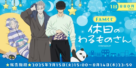 ファンエンゲージメントプラットフォーム「FAM」の企画・開発・運用を手掛ける株式会社Nagisa(本社:東京都渋谷区、代表取締役社長:横山佳幸)は、オンラインくじサービス「FAMくじオンライン」において、<『休日のわるものさん』FAMくじ>を2025年7月15日(火)15:00より販売開始いたします。