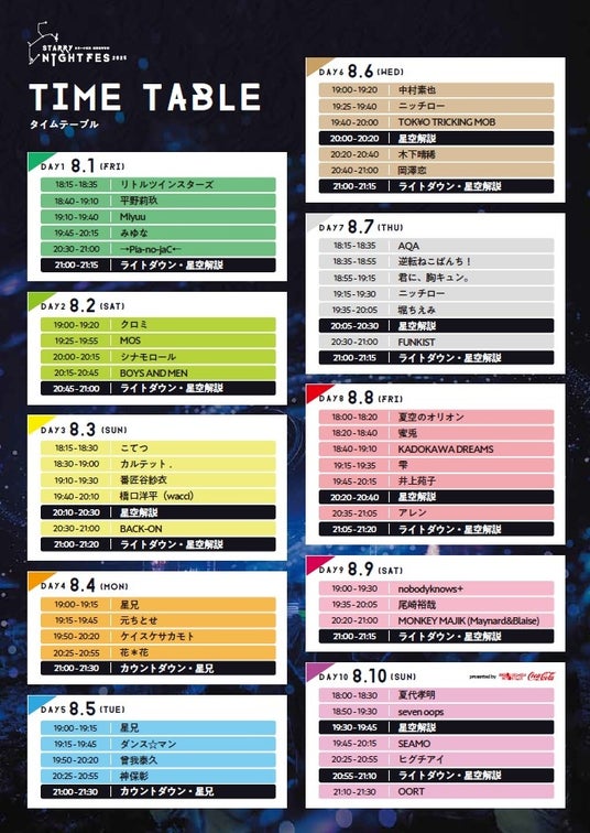 2025年8月1日(金)~8月10日(日)に開催される天空の楽園ナイトツアースペシャルイベント「STARRY NIGHT FES 2025」のタイムテーブルを発表いたしました。