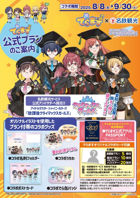 「アイドルマスター シャイニーカラーズ」に登場する『放課後クライマックスガールズ』が名鉄観光サービスの公式アンバサダーに就任し、愛知・名古屋での旅行を盛り上げます。でらます公式プランにはここでしか手に入らないコラボグッズも付属しております。