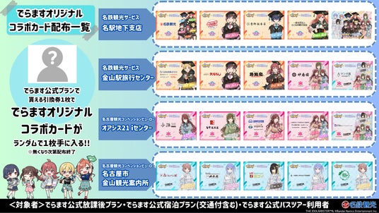 「でらます」とは、名鉄観光サービス株式会社が主催し、『アイドルマスター』シリーズと愛知・名古屋の事業者がコラボレーションする企画名称です。異なる業種の事業者が一丸となり、愛知・名古屋への誘客や観光を盛り上げ、各社のコンテンツや地場産業などとのコラボレーションを展開し、地域の活性化を図っています。